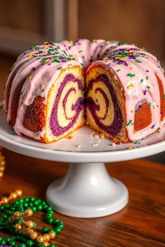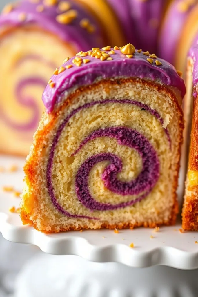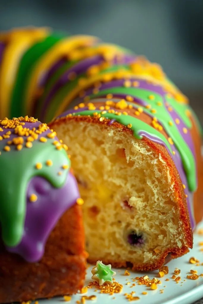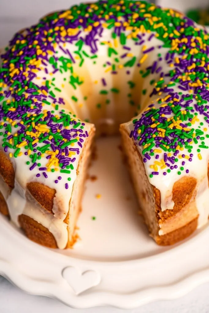 After letting the cake cool for about 20 minutes, I make my simple glaze by mixing powdered sugar, milk, vanilla, and a splash of lemon juice. I pour this all over the cake and quickly sprinkle with bands of purple, green, and gold sugar before the glaze sets. If I’m using a plastic baby, I carefully insert it from the bottom of the cake once it’s completely cool.